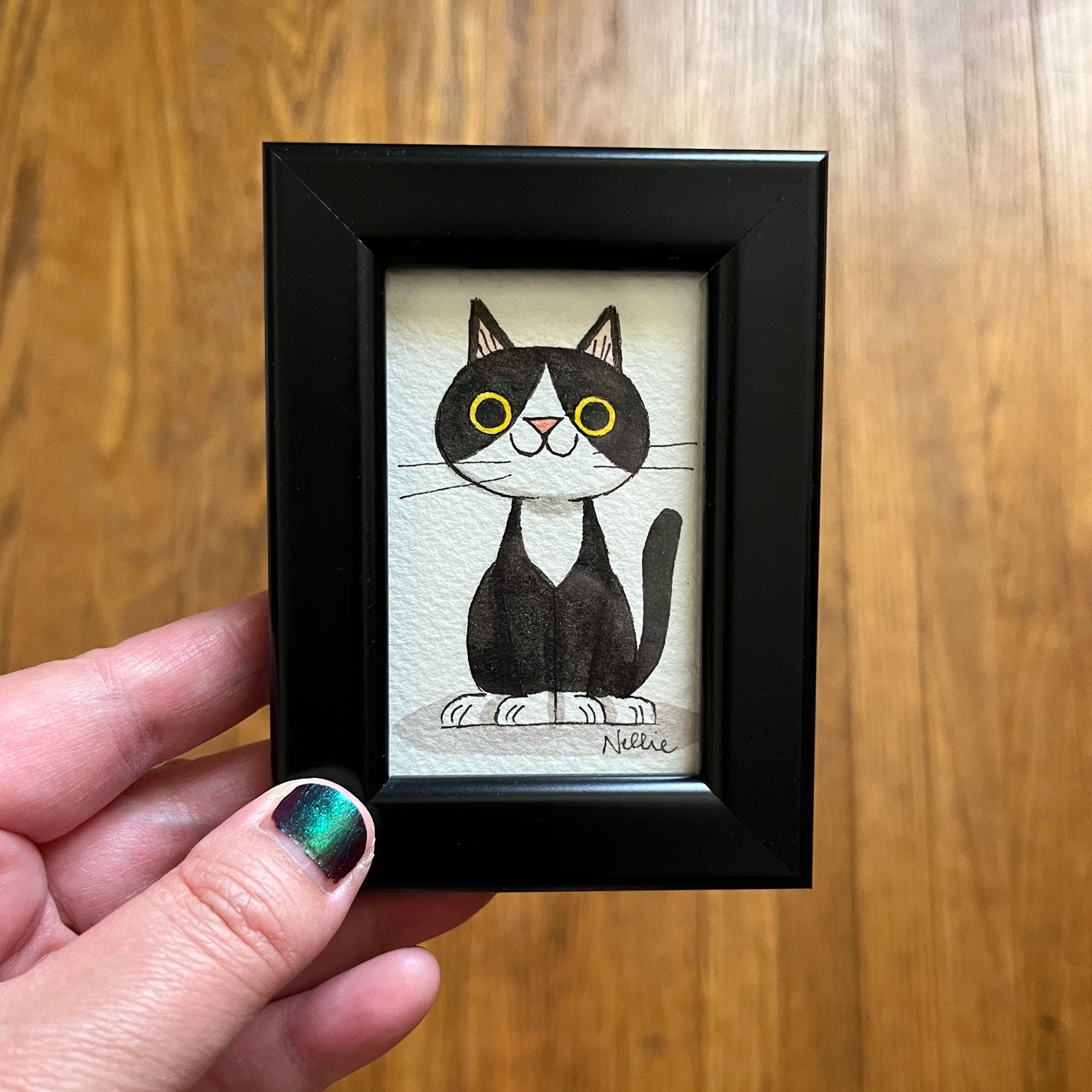 Black Tuxedo Cat 10 - Framed Tiny Painting
